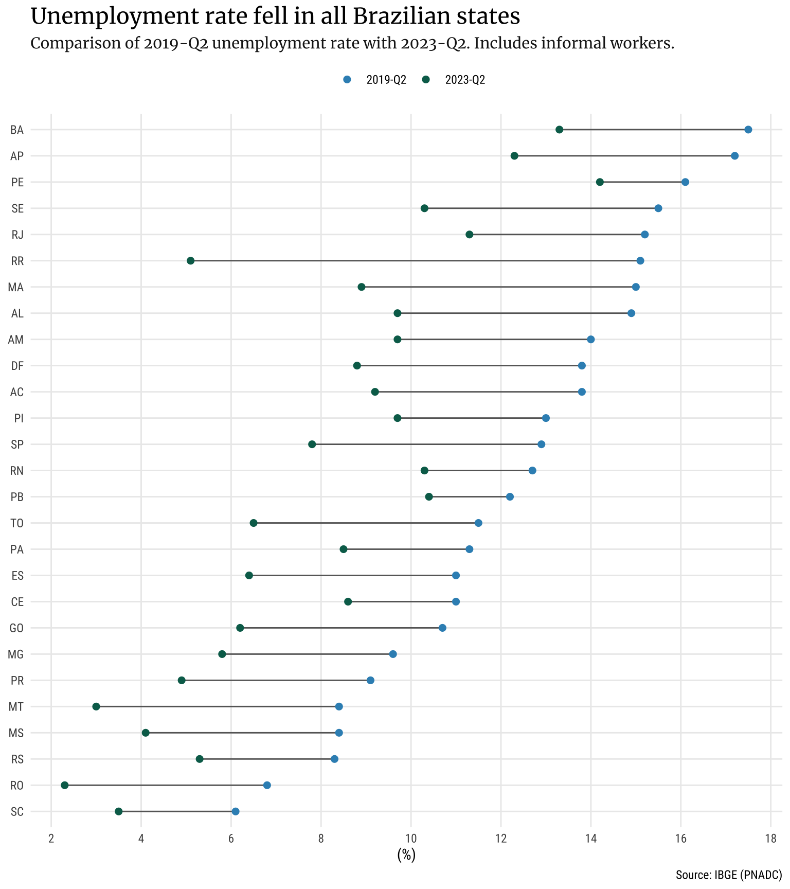 Comparing unemployment rates between Q2 2019 (pre-pandemic) and Q2 2023 shows a universal improvement across all 27 Brazilian states.