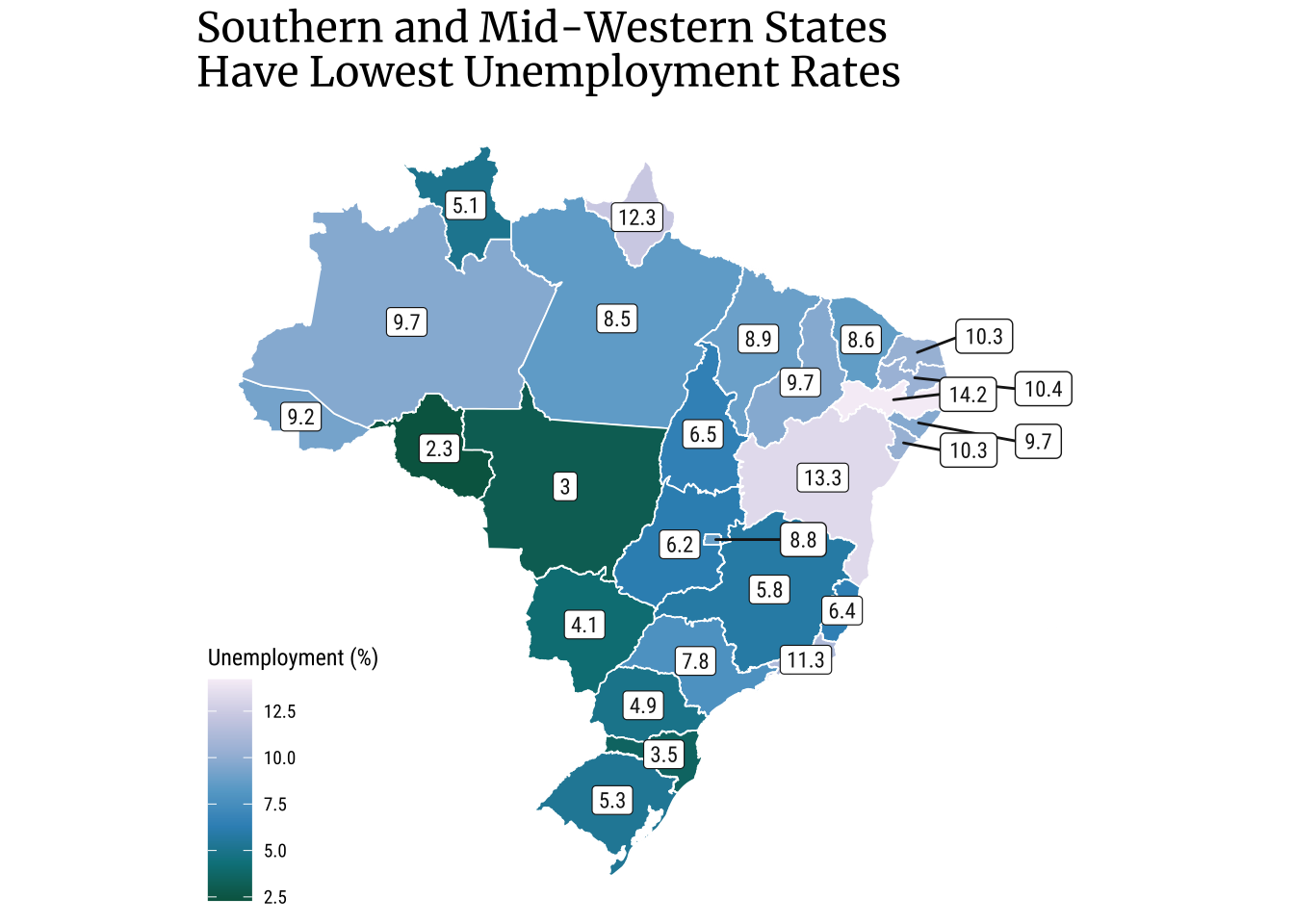 Southern states (Santa Catarina at 3.5%, Rio Grande do Sul at 4.9%) and Central-Western states (Rondônia at 2.3%, Mato Grosso do Sul at 4.1%) exhibit the lowest unemployment rates, reflecting their stronger agricultural sectors and more diversified economies. In contrast, Northeastern states continue to face higher unemployment, with Pernambuco (13.3%) and Bahia (14.2%) among the highest in the country. These persistent regional disparities underscore the uneven economic development across Brazil’s macroregions.
