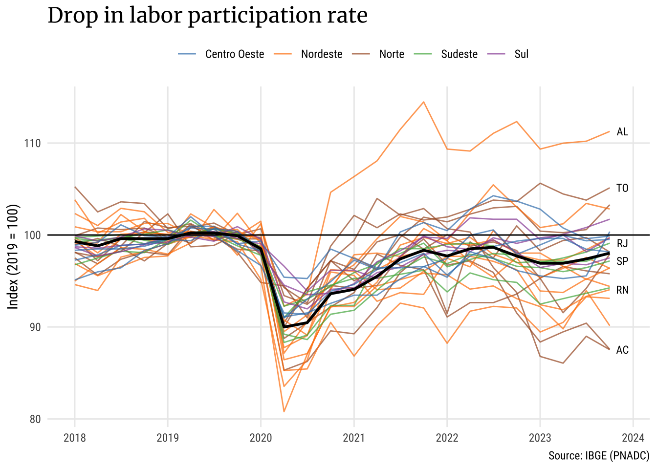 The labor force participation rate (indexed to 2019 = 100) shows a concerning trend: Brazil has not returned to pre-pandemic levels of labor market engagement. The thick black line representing the national average hovers below 100, indicating that fewer working-age Brazilians are actively employed or seeking employment compared to 2019. Regional variation is substantial—Alagoas (AL) shows participation rates above 110, while Acre (AC) has declined to around 87. This heterogeneity reflects different demographic trends, pension reforms, and regional economic conditions affecting people’s decisions to participate in the labor force.
