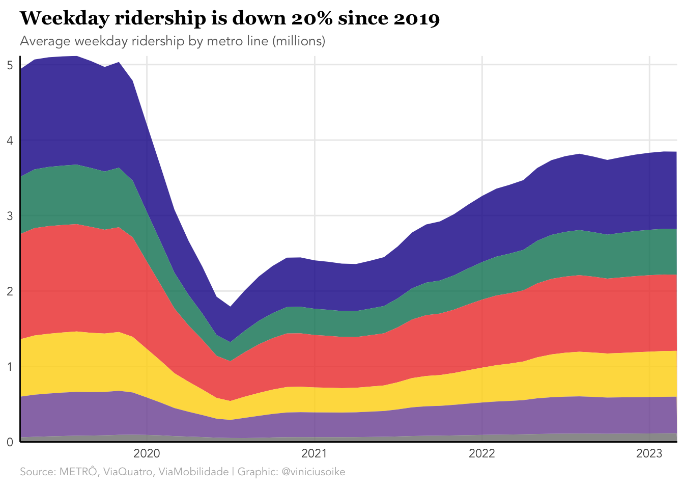 Despite gradual improvements since the depths of the pandemic, São Paulo’s metro system remains well below pre-pandemic ridership levels.
