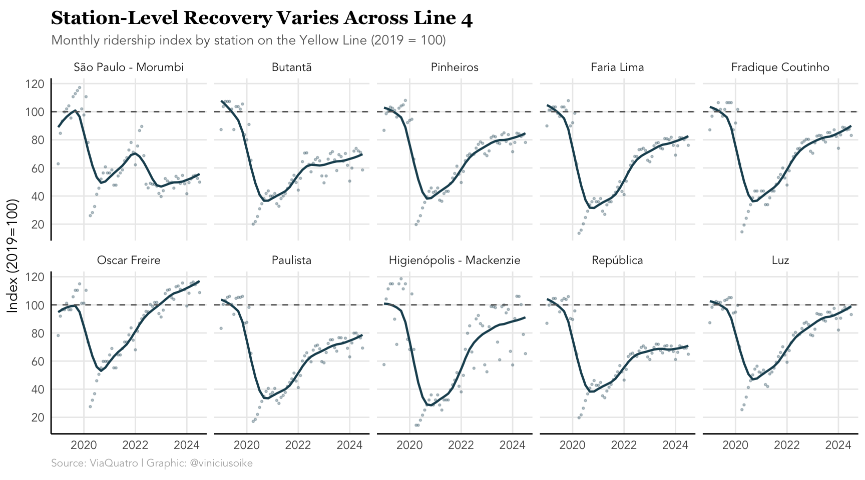 Station-level data reveals significant variation in recovery trajectories. Some stations, like Oscar Freire and Paulista—located in São Paulo’s high-end commercial and business districts—show stronger recovery, potentially reflecting their role as destinations for both work and leisure activities. In contrast, primarily residential stations show more modest recovery, consistent with reduced commuting demand. Notably, several stations have surpassed their 2019 ridership levels by 2023, suggesting localized growth or shifting travel patterns within the metro network.