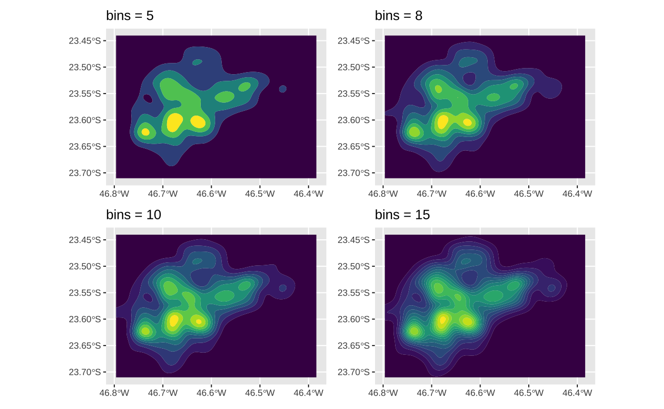 . Os mapas abaixo mostram como este argumento controla o número de quebras nas linhas de contorno. A função que calcula os contornos é a MASS::kde2d()
