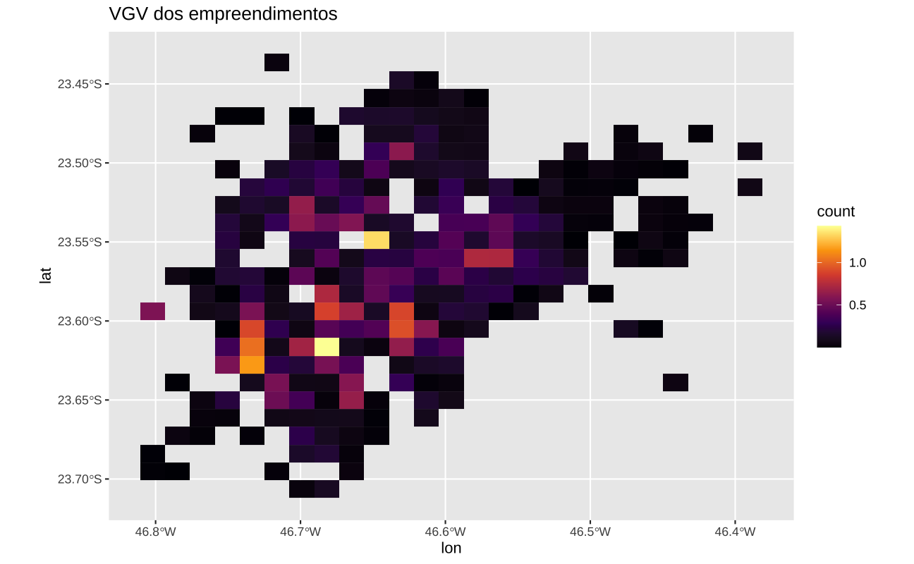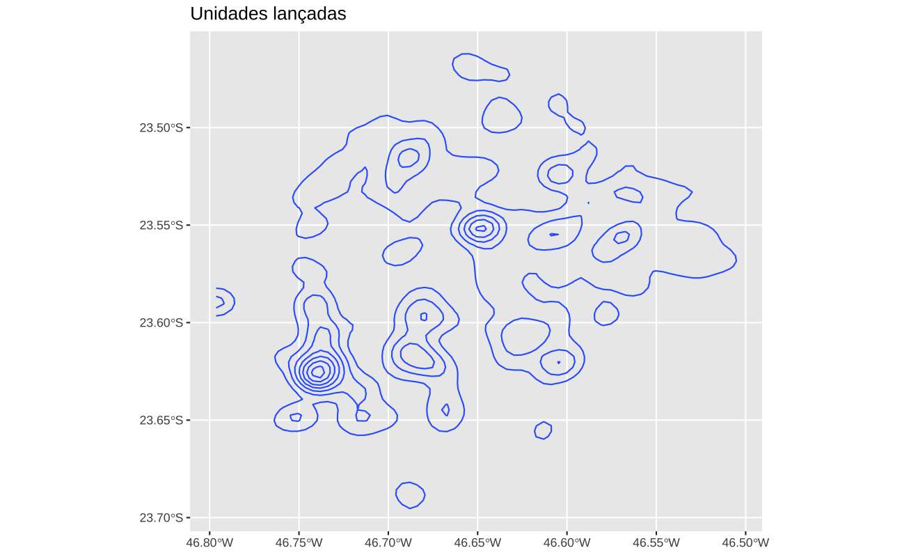 No plano cartesiano, longitude e latitude são literalmente coordenadas; pode-se mapear estas coordenadas como pontos num gráfico de dispersão. Para tornar os exemplos mais aplicados vamos usar a base de Empreendimentos Residenciais Verticais da Embraesp, disponibilizado pelo Centro de Estudos da Metrópole da FAU/USP. Os dados compreendem todos os lançamentos residenciais na Região Metropolitana de São Paulo entre 1985 e 2013. Para simplificar nossa análise vamos nos restringir somente aos empreendimentos lançados na capital.