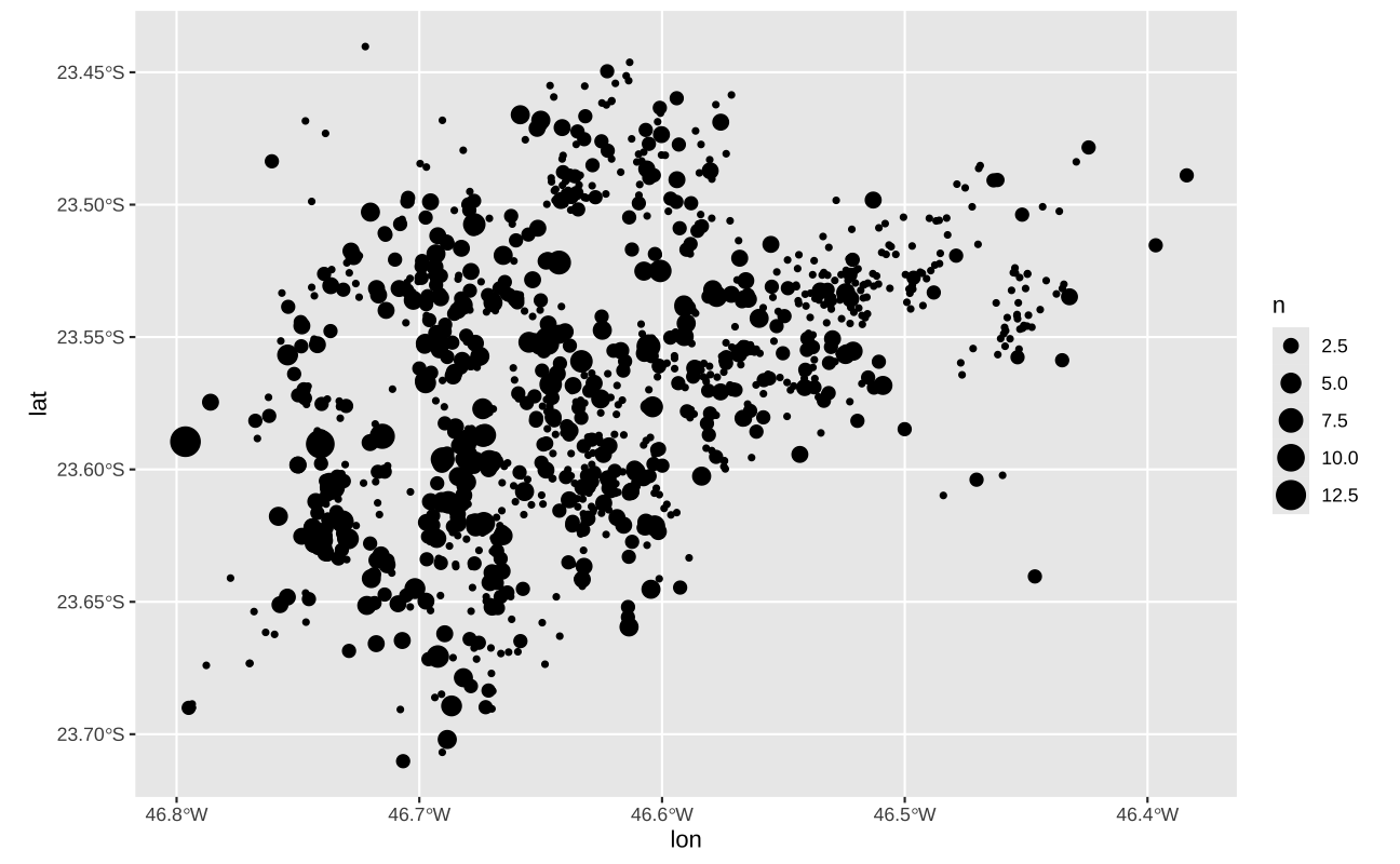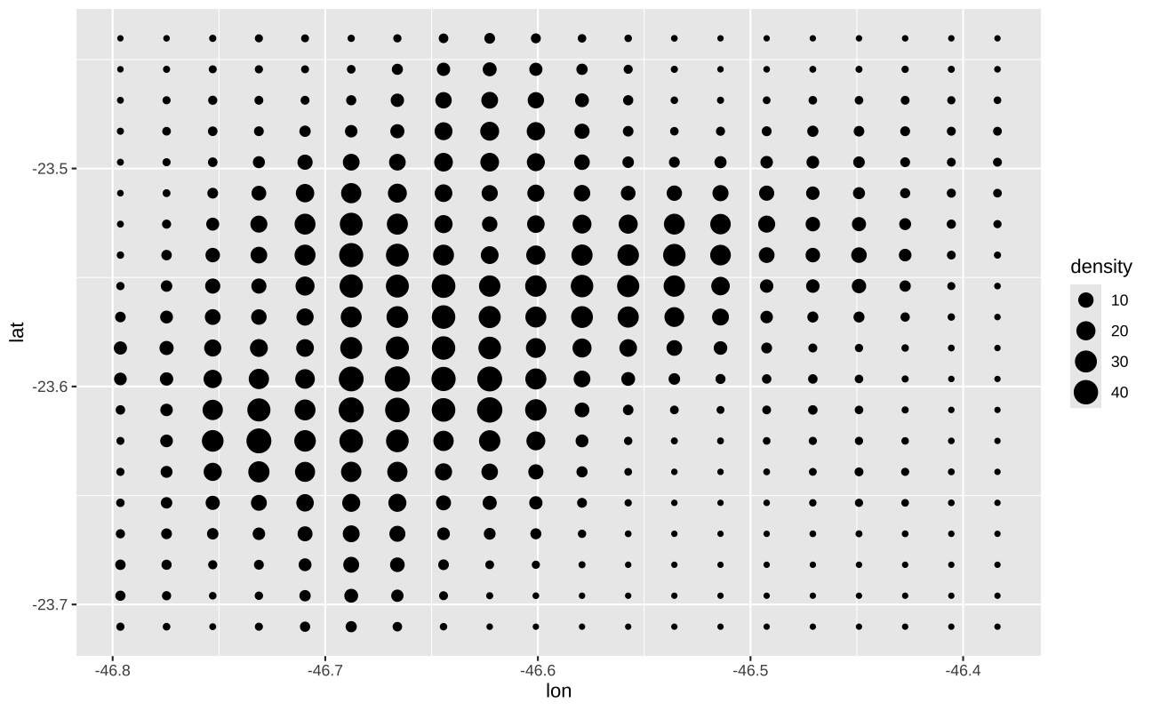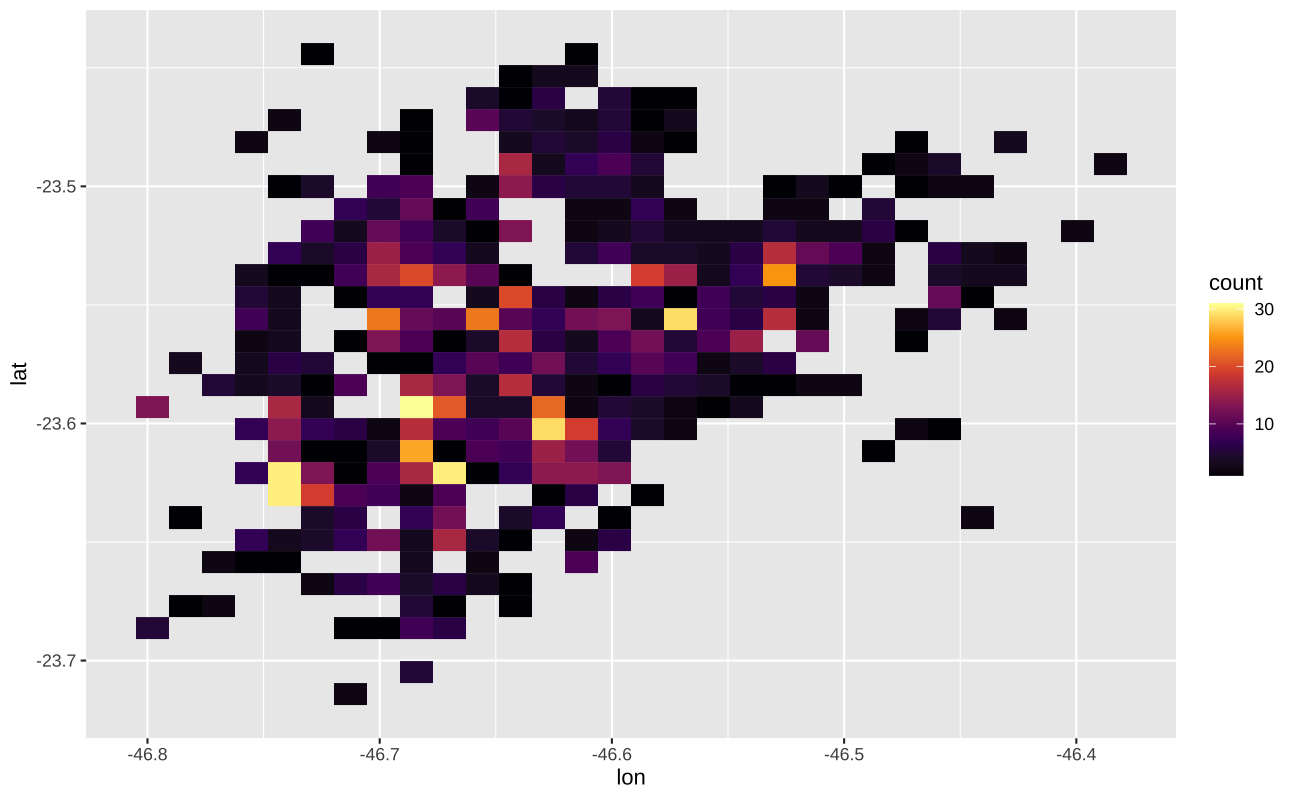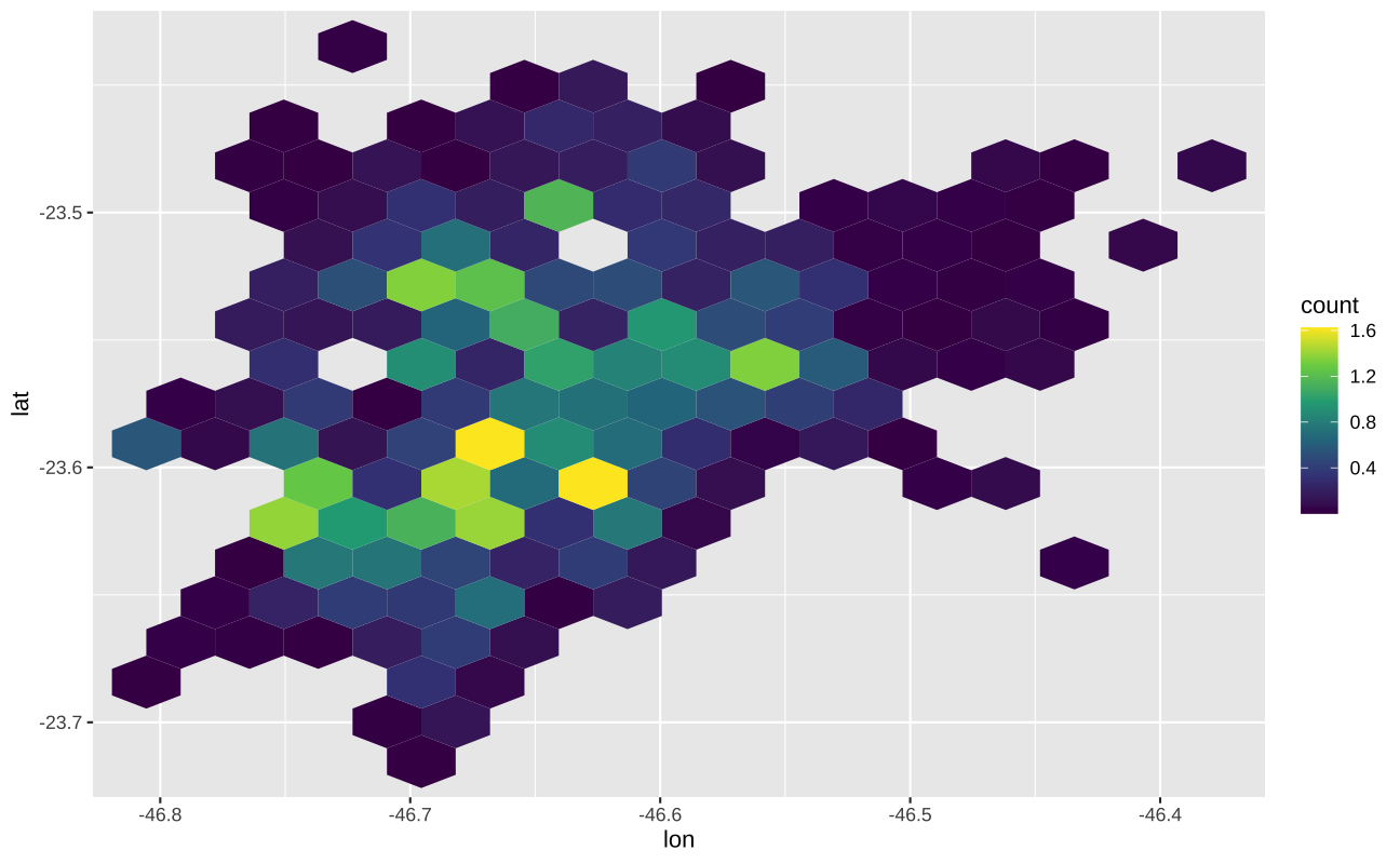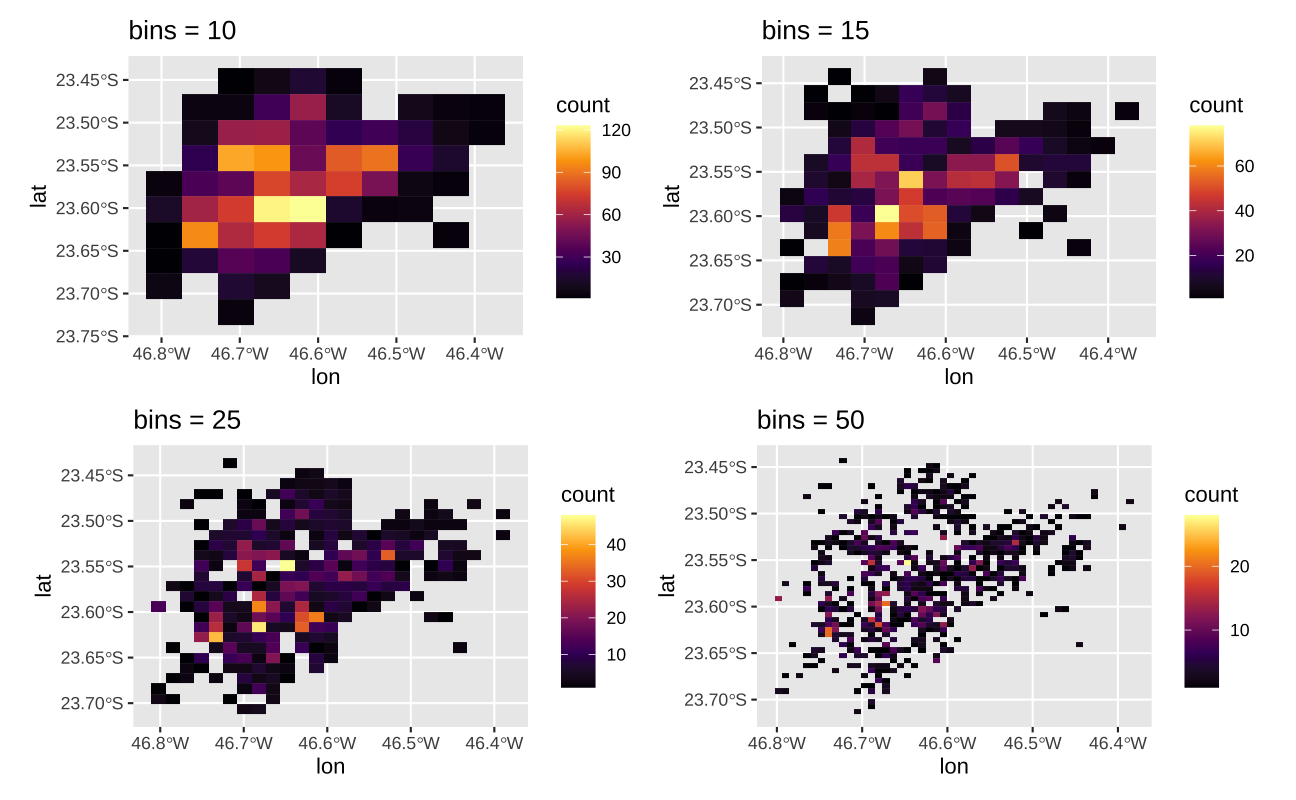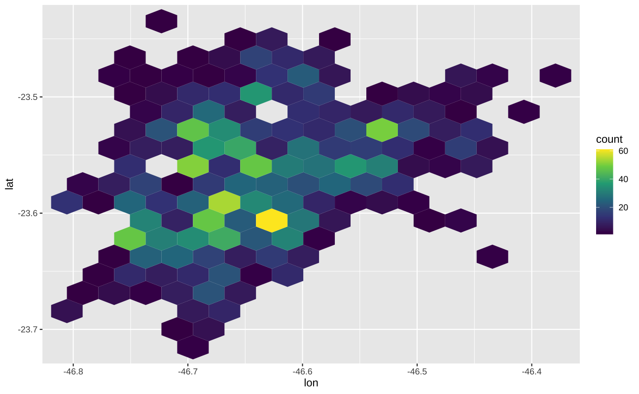 Neste post vimos como utilizar a informação “crua” de latitude e longitude para gerar mapas simples de pontos e mapas de calor em geral. Estes mapas, em geral, não costumam servir para publicações ou trabalhos mais sérios, mas podem ser muito úteis para a exploração de dados. As mesmas técnicas de agregação de pontos também podem ser utilizadas em gráficos de dispersão convencionais, para evitar o overplotting.