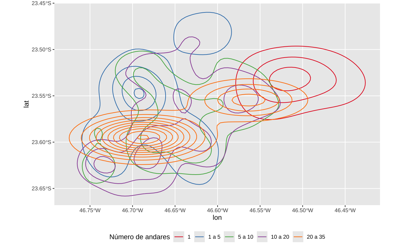 Pode-se separar os contornos em grupos com cores distintas. No gráfico abaixo eu separo os empreendimentos pelo número de andares. Vê-se que os empreendimentos horizontais simples, de apenas um andar, estão concentrados no lado nordeste do gráfico. Já os empreendimentos verticais mais elevados (20 a 35 andares) estão concentrados no sudoeste do gráfico (grosso modo, região do Itaim Bibi) e na região oeste (grosso modo, região da Vila Formosa).