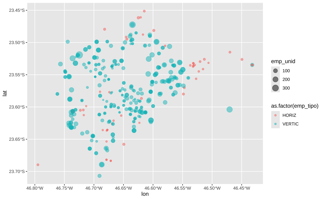 No exemplo abaixo, o tamanho de cada círculo é proporcional ao número de unidades do empreendimento e a cor sinaliza se o empreendimento é veritical ou horizontal.