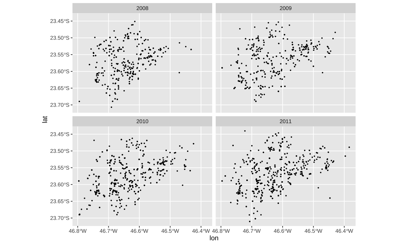 Pode-se também fazer gráficos em facets usando os dados de longitude e latitude. No gráfico abaixo, mostro os lançamentos ano a ano no período 2008-2011.