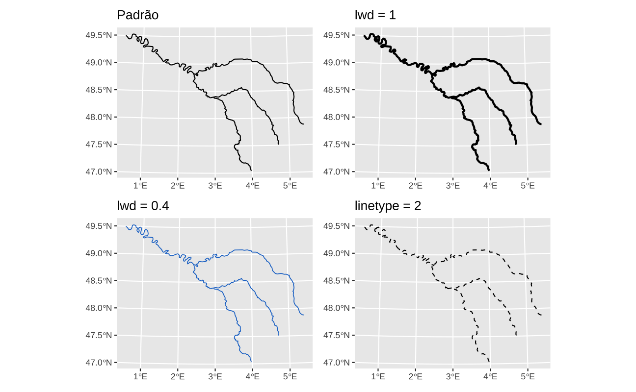 , respectivamente. Assim, para tornar um objeto espacial, em formato de linha, mais grosso, usa-se linewidth = 2