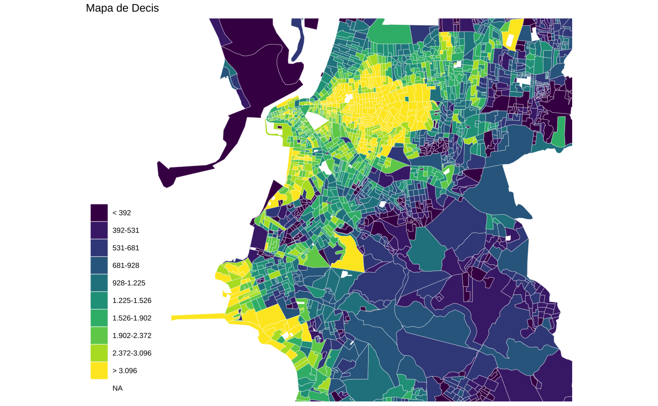 O mapa abaixo mostra a renda per capita em decis. Agora usamos a escala de cores viridis