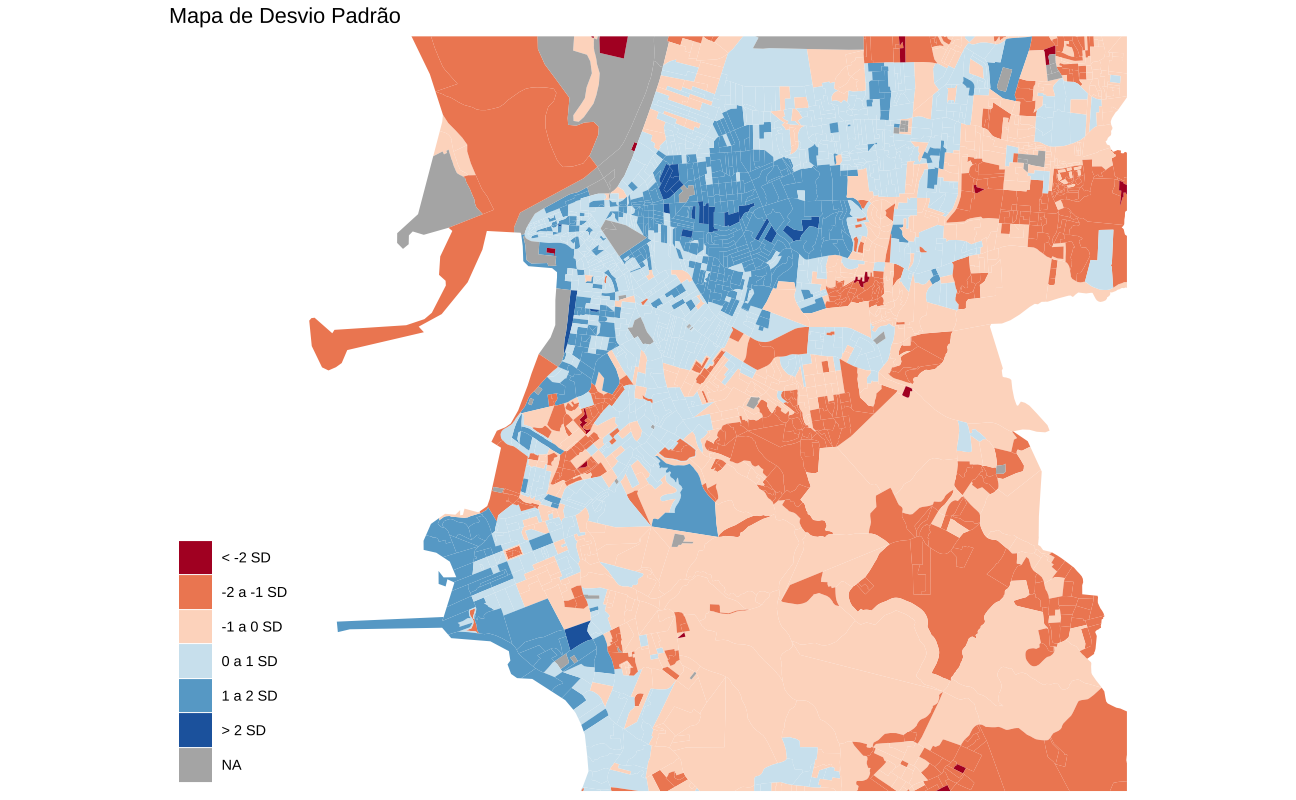 Também é possível construir mapas usando medidas de dispersão estatísticas tradicionais, como a distância interquartílica ou desvio-padrão. Neste exemplo, vamos classificar os dados como desvios-padrão em relação à média. Para melhorar a visualização, vamos primeiro usar uma transformação log nos dados de renda para que a distribuição fique mais próxima de uma normal.