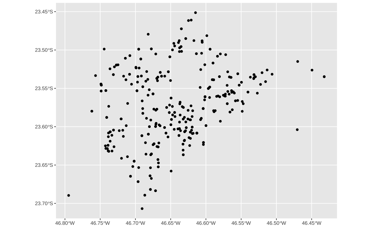 O tipo mais simples de objeto geométrico é o ponto, definido por uma coordenada horizontal e uma coordenada vertical. O exemplo abaixo mostra como criar um spatial data.frame