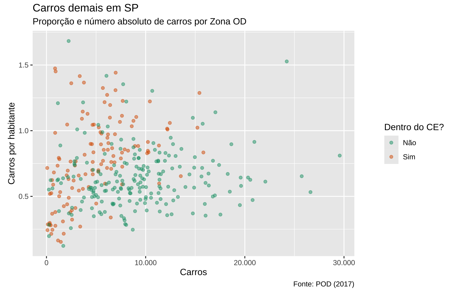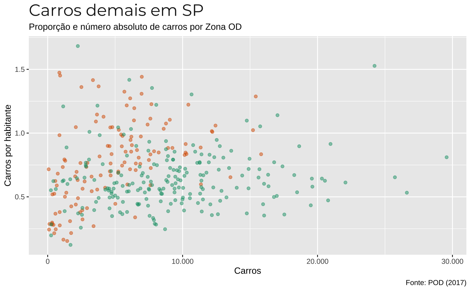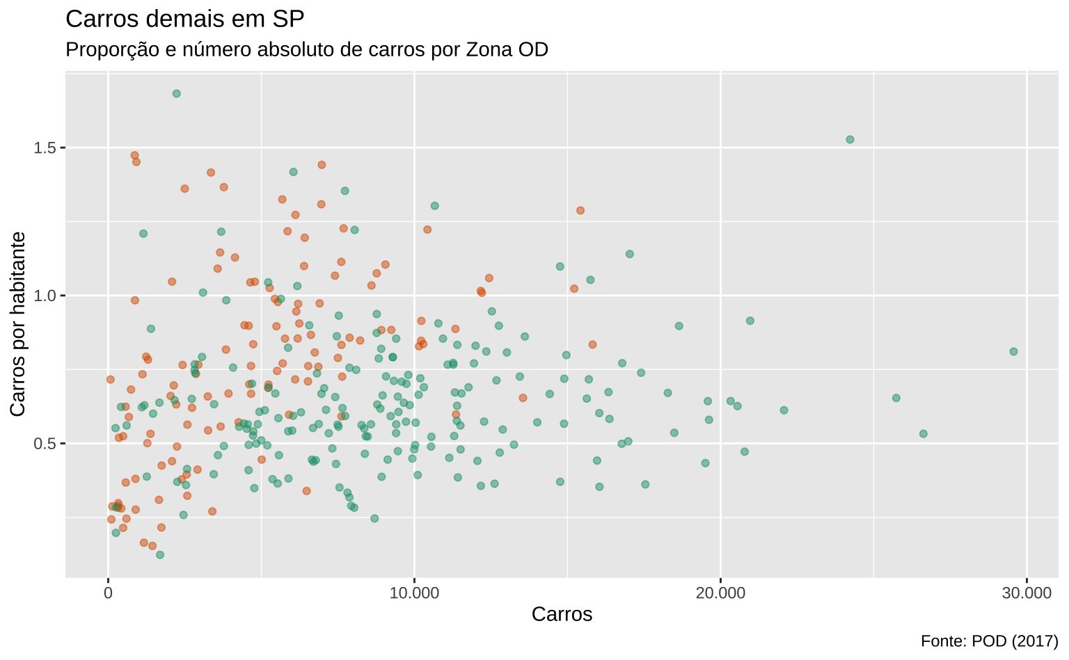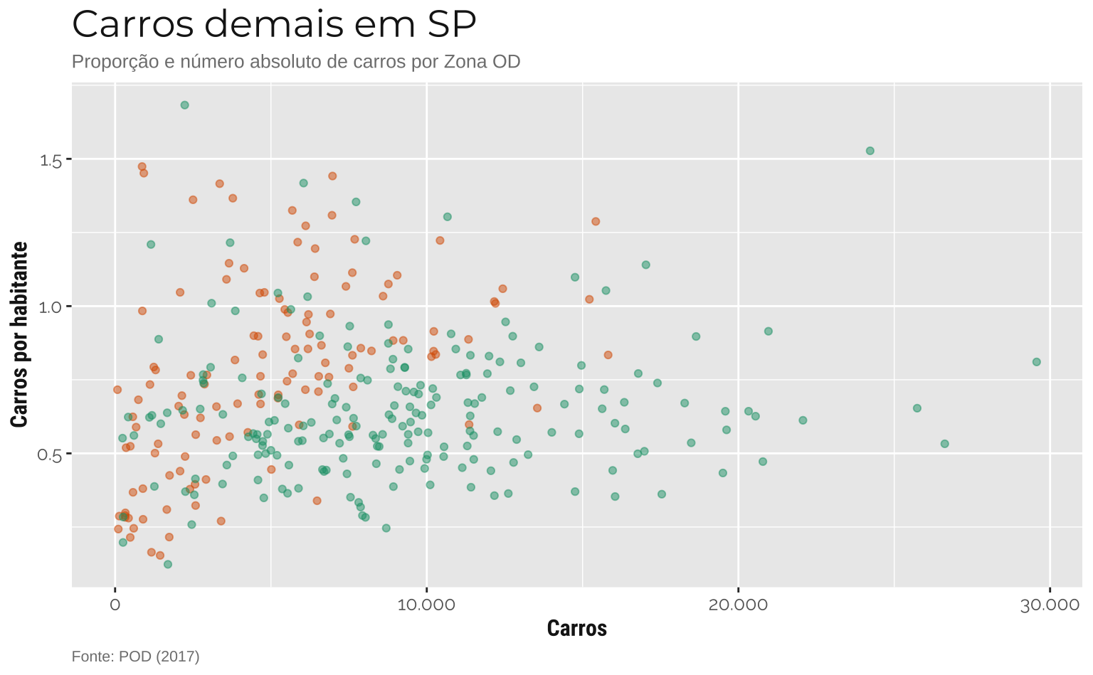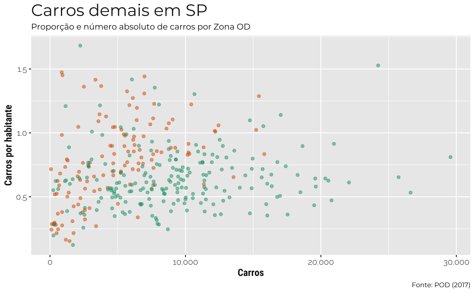 O gráfico abaixo usa a mesma base da Pesquisa Origem e Destino (POD) do post anterior e mostra o número absoluto de carros no eixo-x e o número de carros por domicílio no eixo-y.