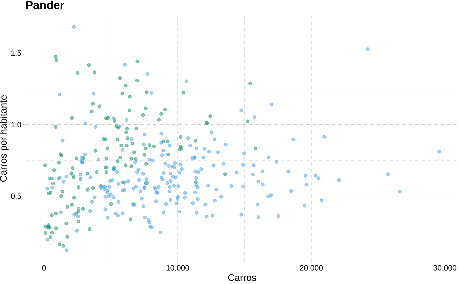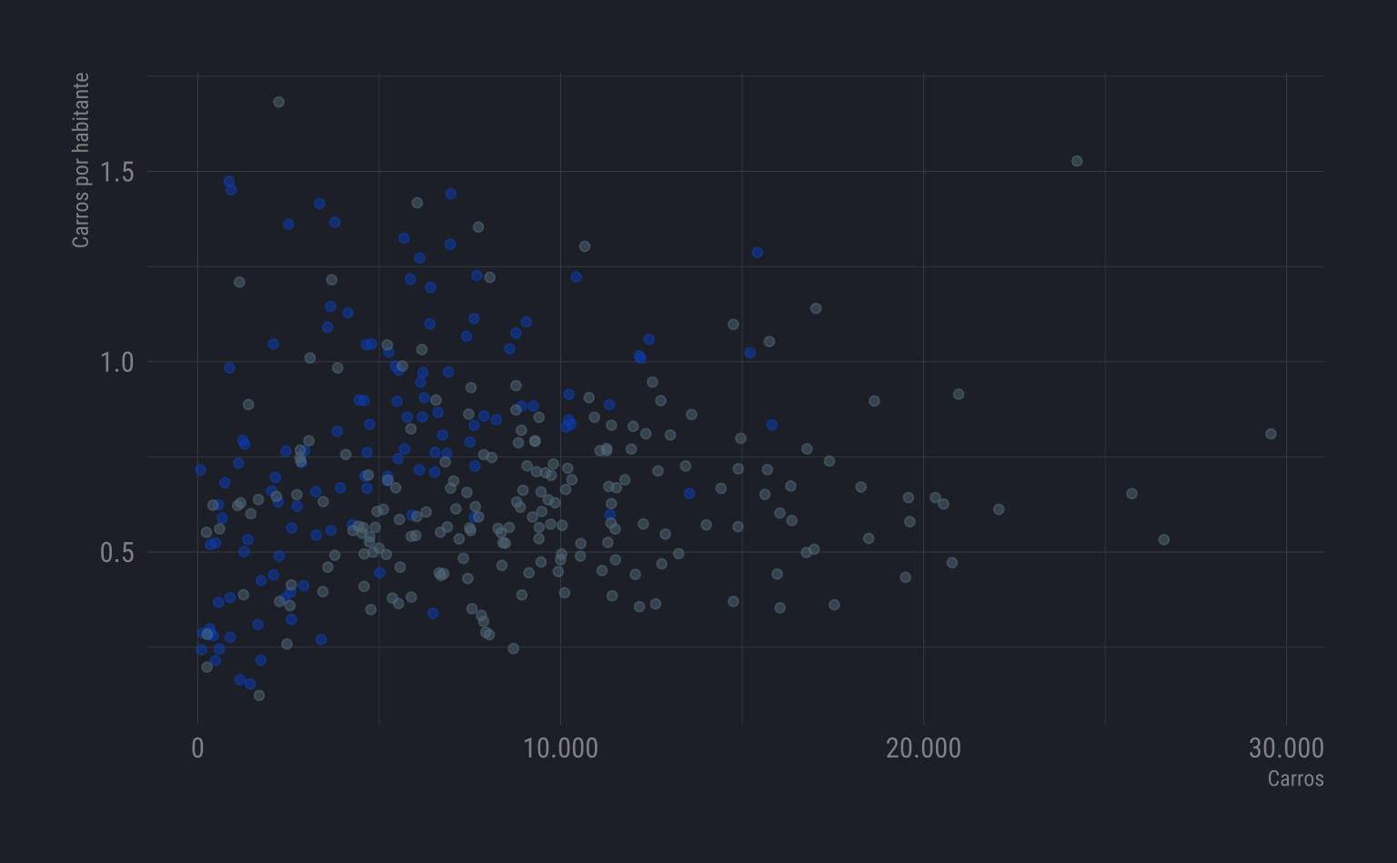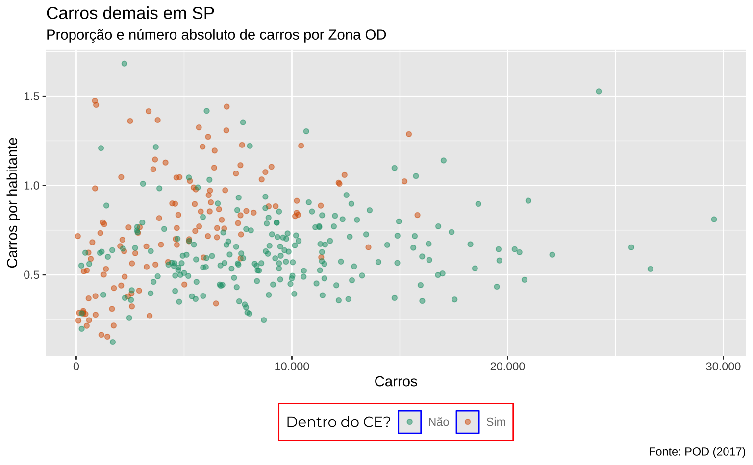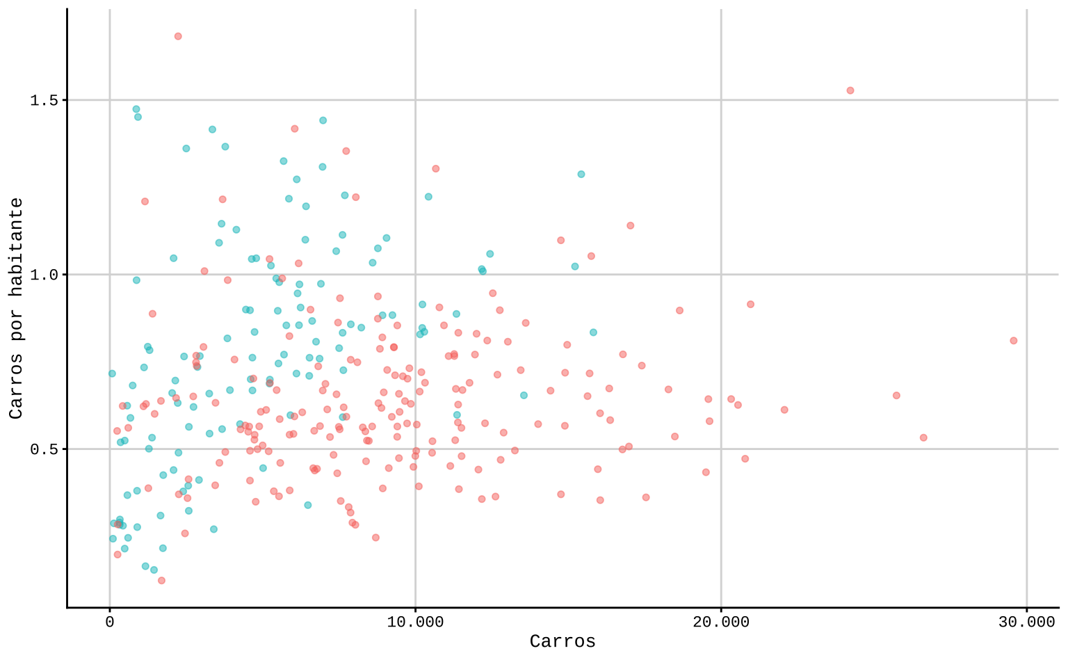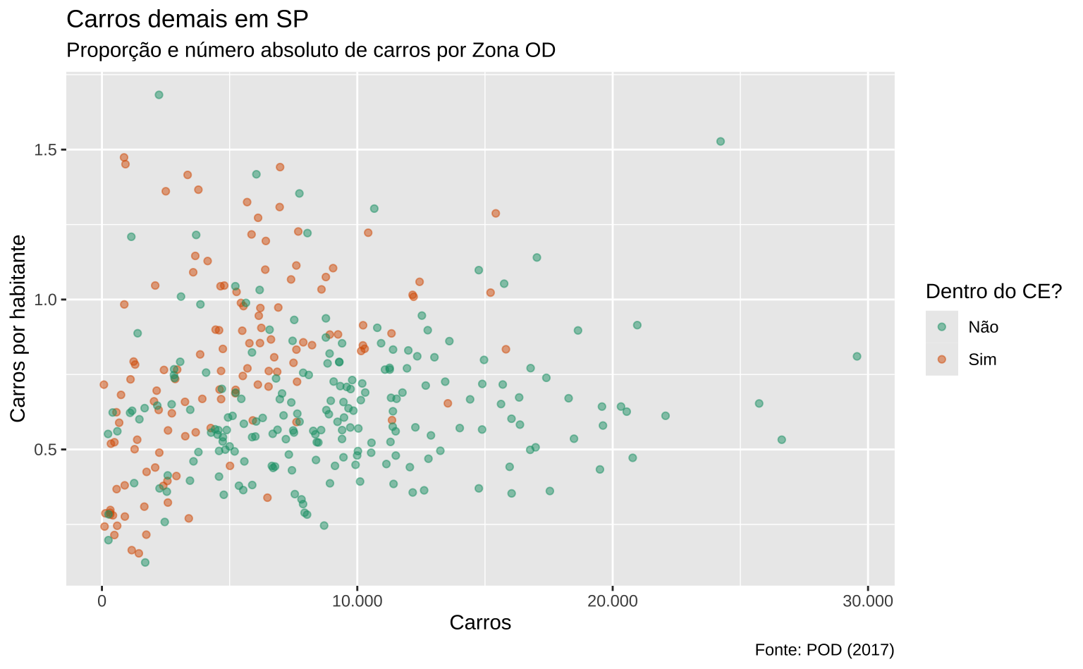 O gráfico abaixo usa a mesma base da Pesquisa Origem e Destino (POD) do post anterior e mostra o número absoluto de carros no eixo-x e o número de carros por domicílio no eixo-y.