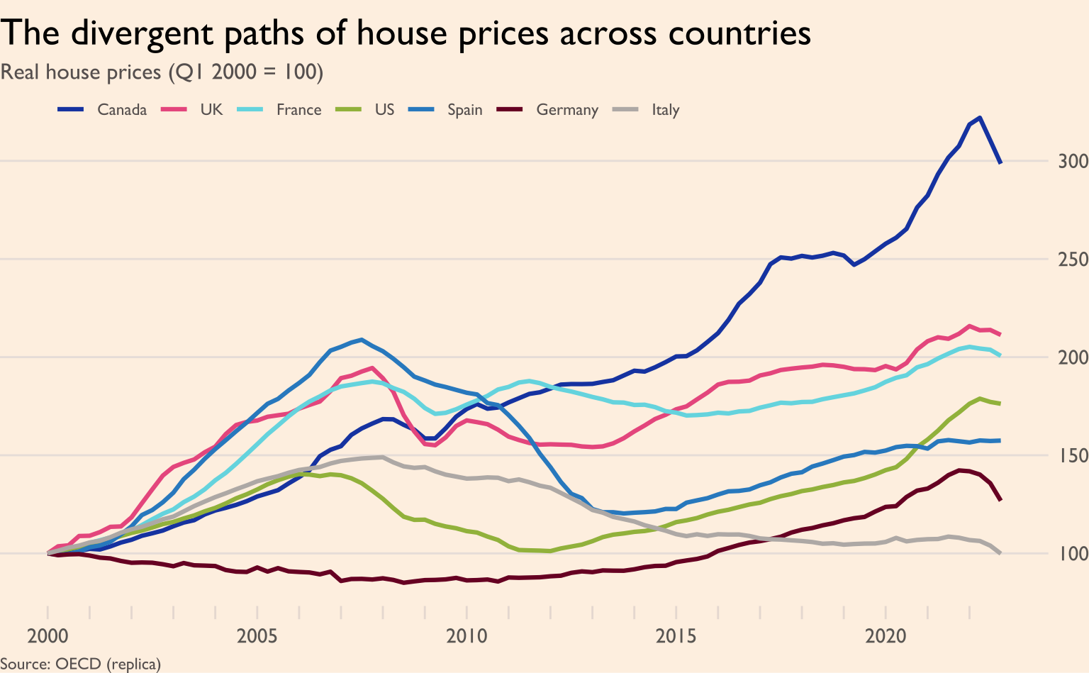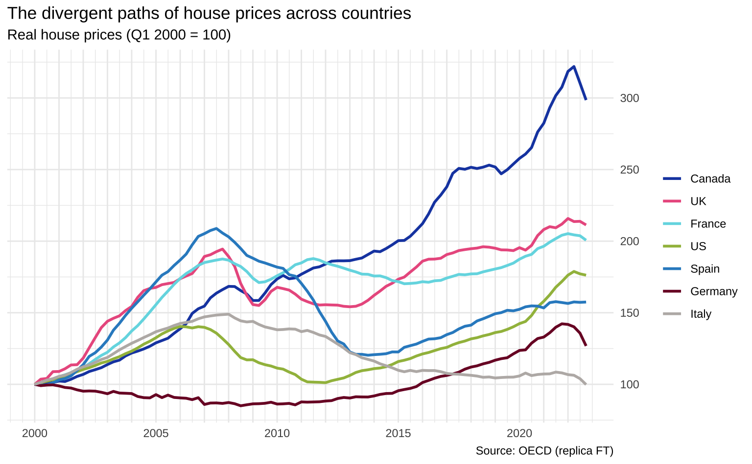 subtitle = "Real house prices (Q1 2000 = 100)",