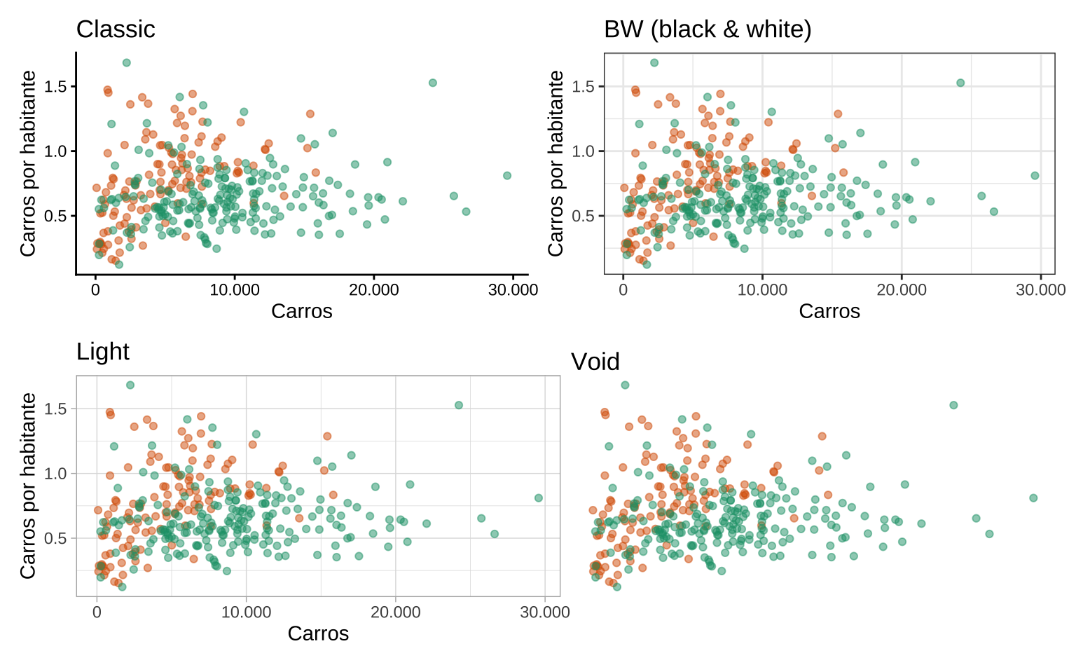 vale começar com os temas “completos”. Estas funções acompanham os pacotes ggplot2