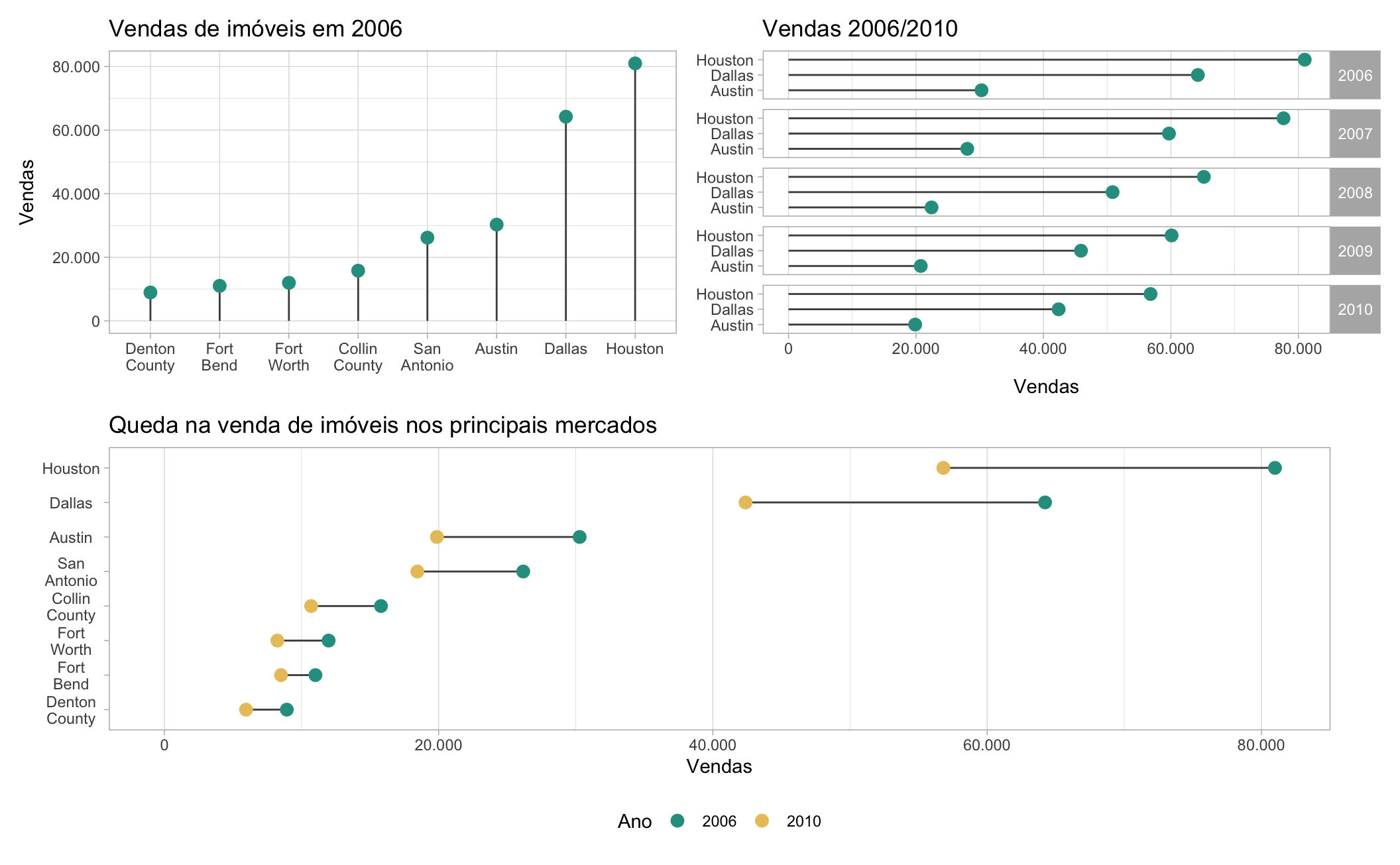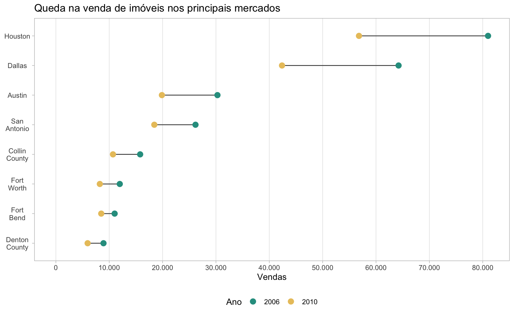 O gráfico abaixo mostra a queda na venda de imóveis nestas cidades entre os anos de 2006 a 2010. No caso de Houston, a queda foi de mais de 20 mil unidades. Note que a diferença no porte das cidades acaba dificultando a comparação da queda nas vendas nas regiões menores como Fort Bend e Denton County.