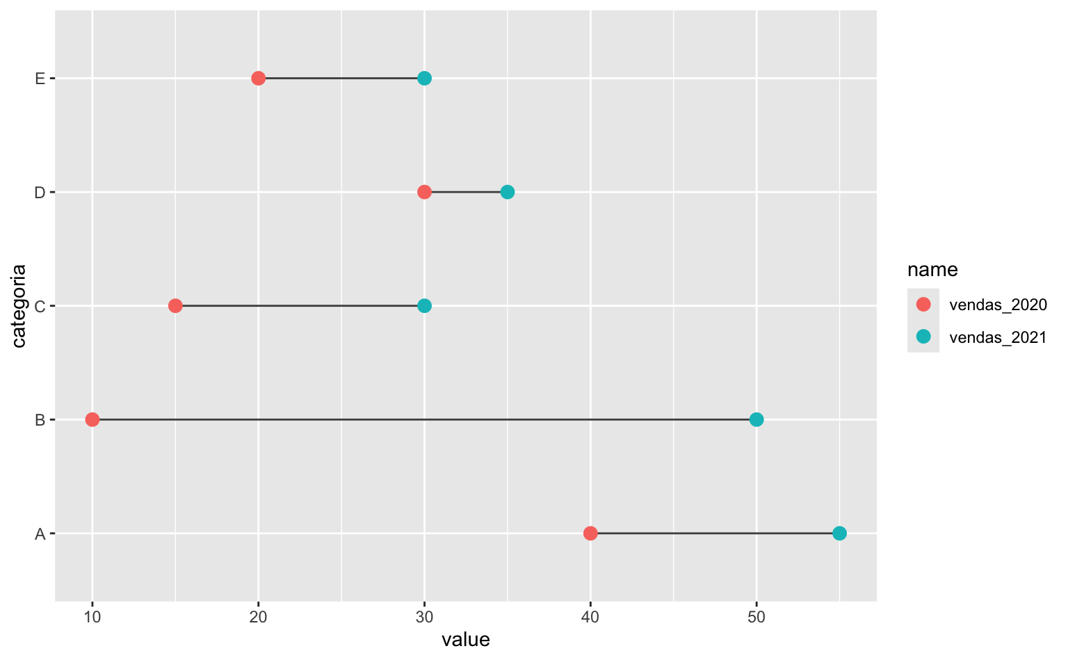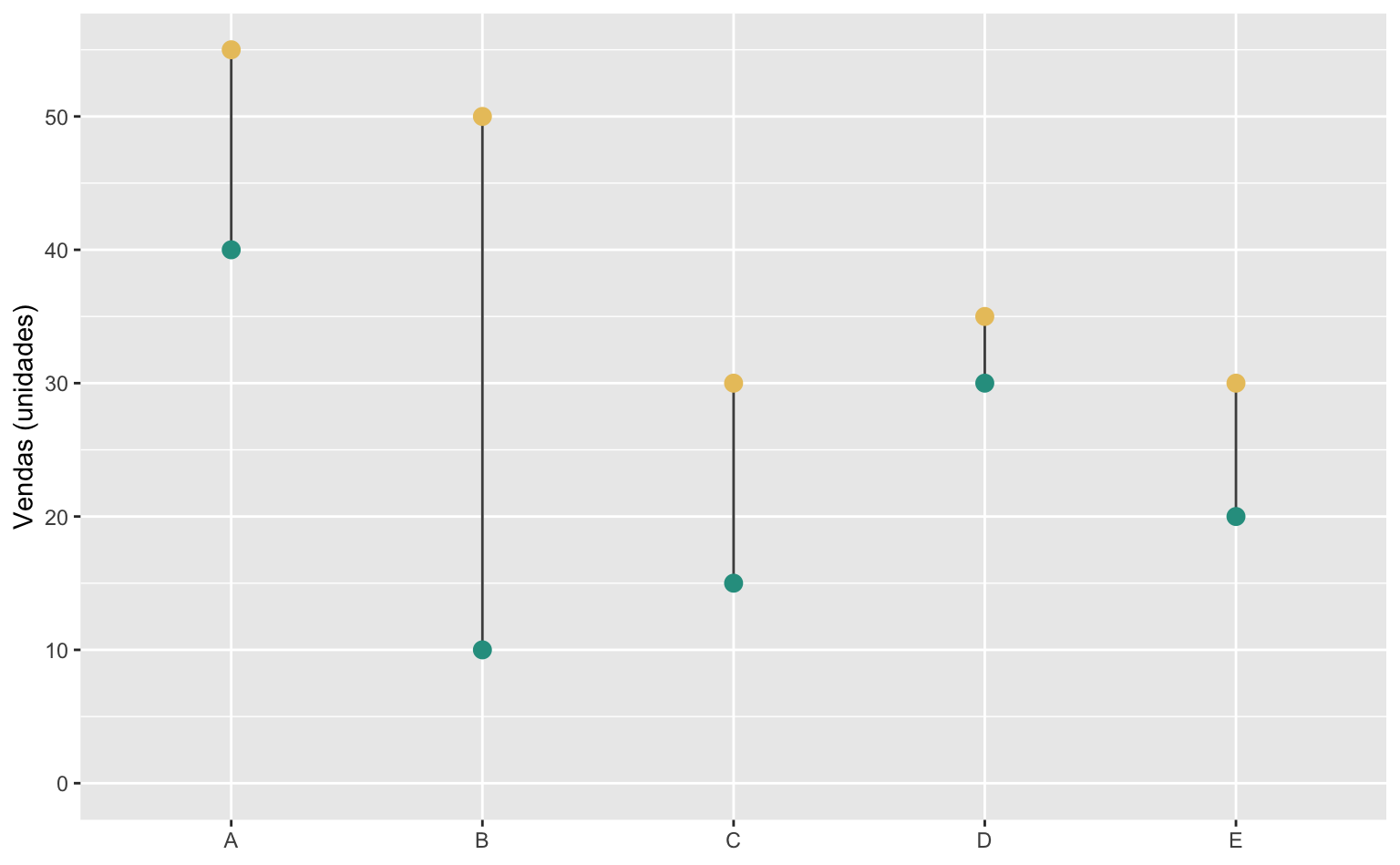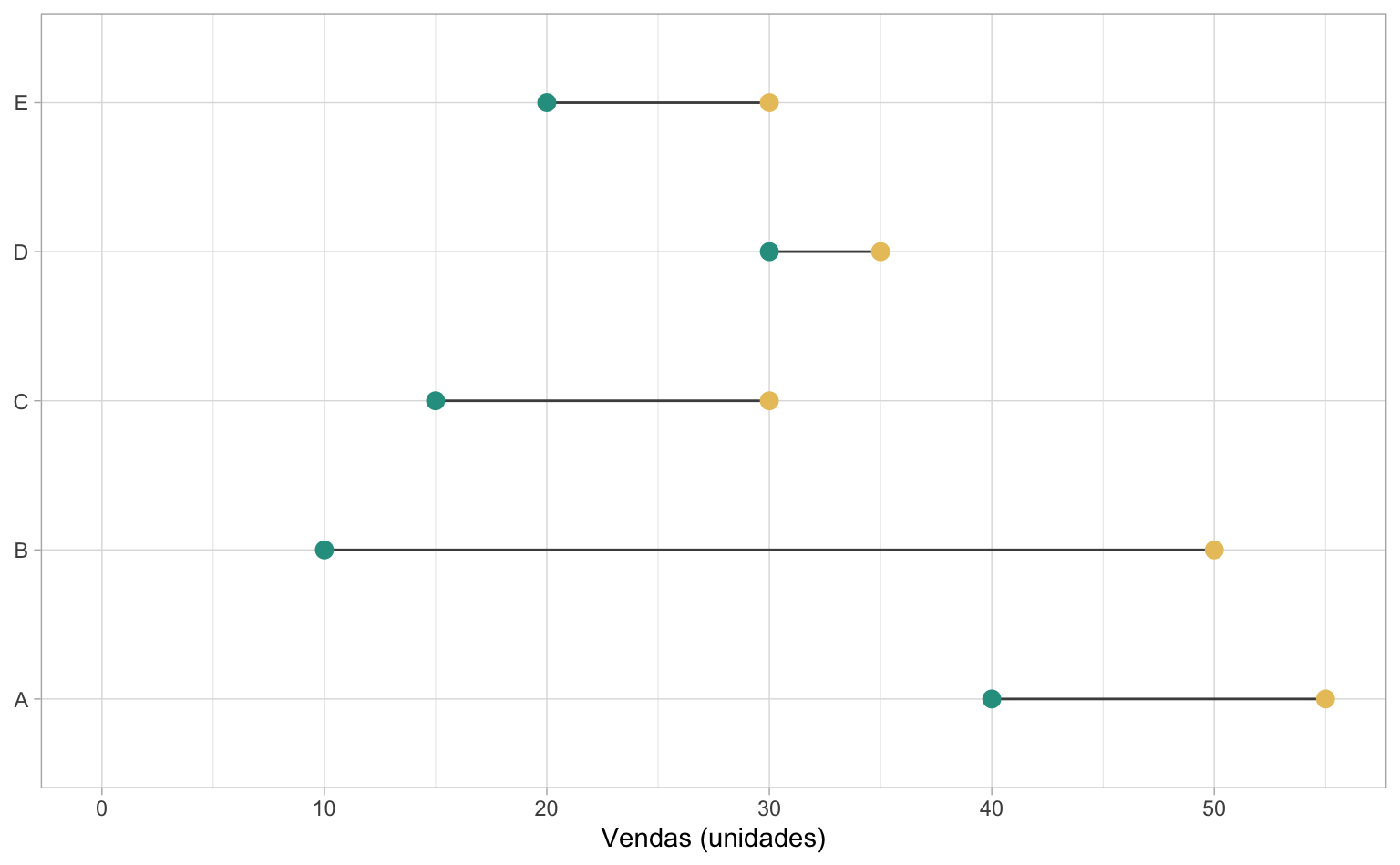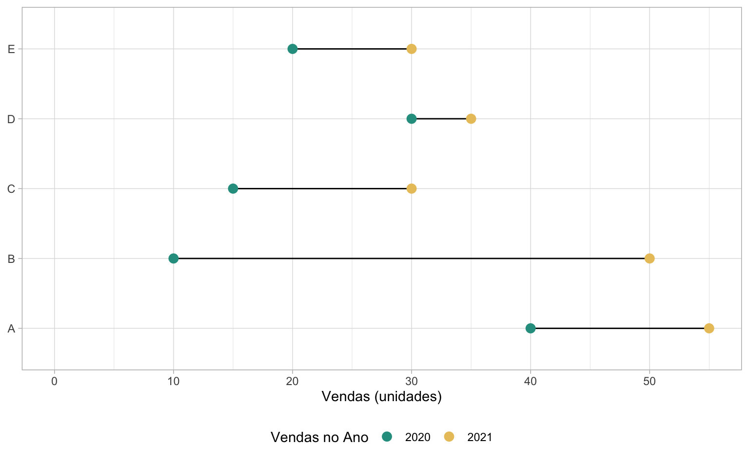 De fato, o gráfico de lollipop pode ser utilizado para mostrar valores, mas uma das suas principais vantanges está em poder comparar valores entre grupos. No nosso caso, temos os valores das vendas de 2020 e 2021 de cinco grupos distinos (A, B, C, D, e E). Podemos montar um gráfico que enfatiza a evolução das vendas em cada um dos grupos.