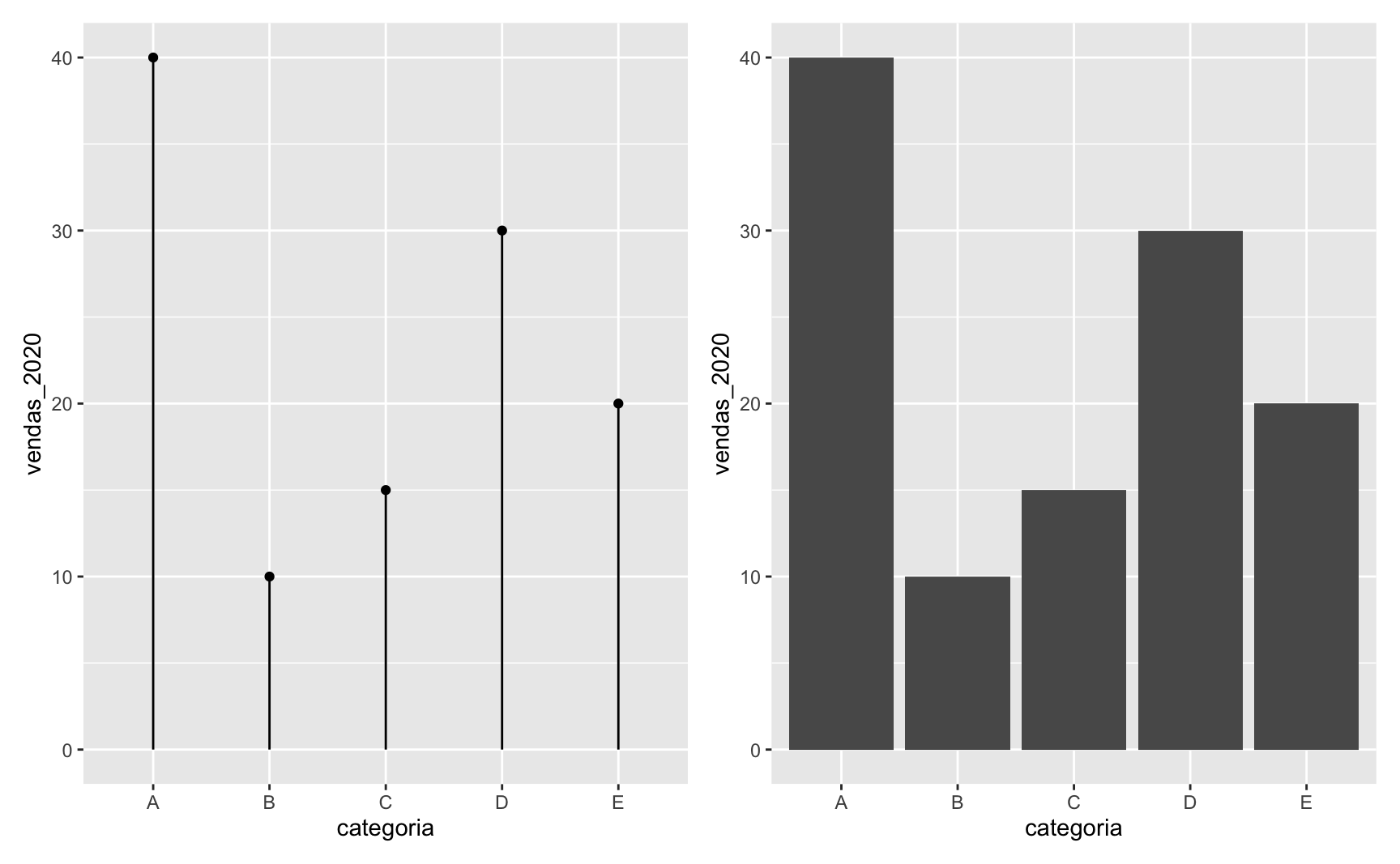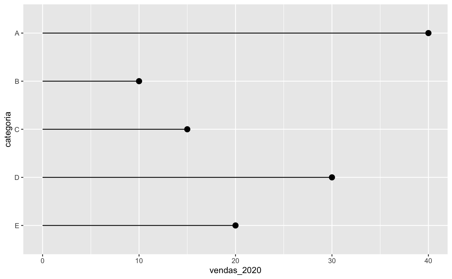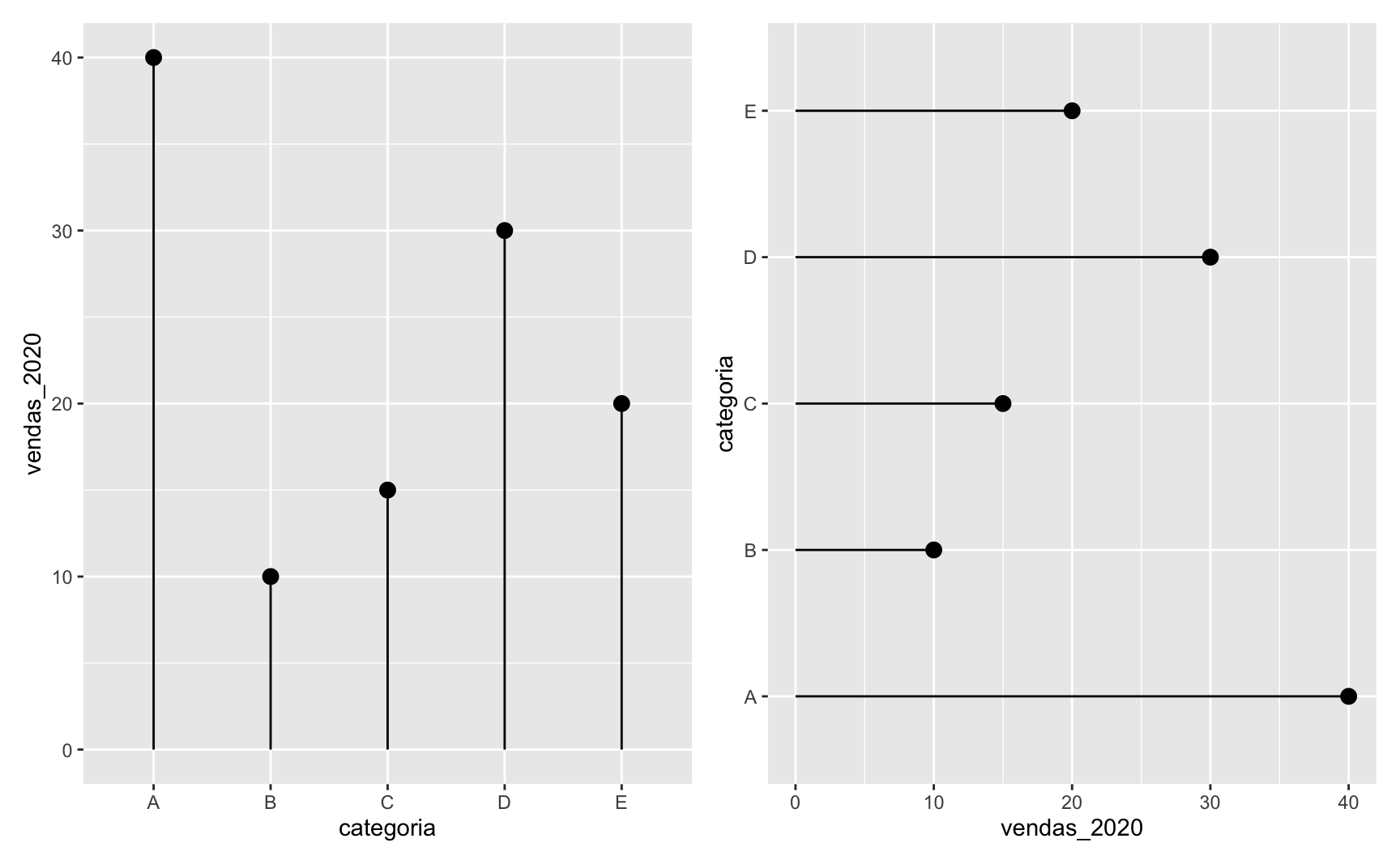 Até aqui, o gráfico de lollipop parece muito similar a um gráfico de colunas, com as desvantagens de ser mais complexo e de exigir mais linhas de código. O exemplo abaixo deixa isto evidente.