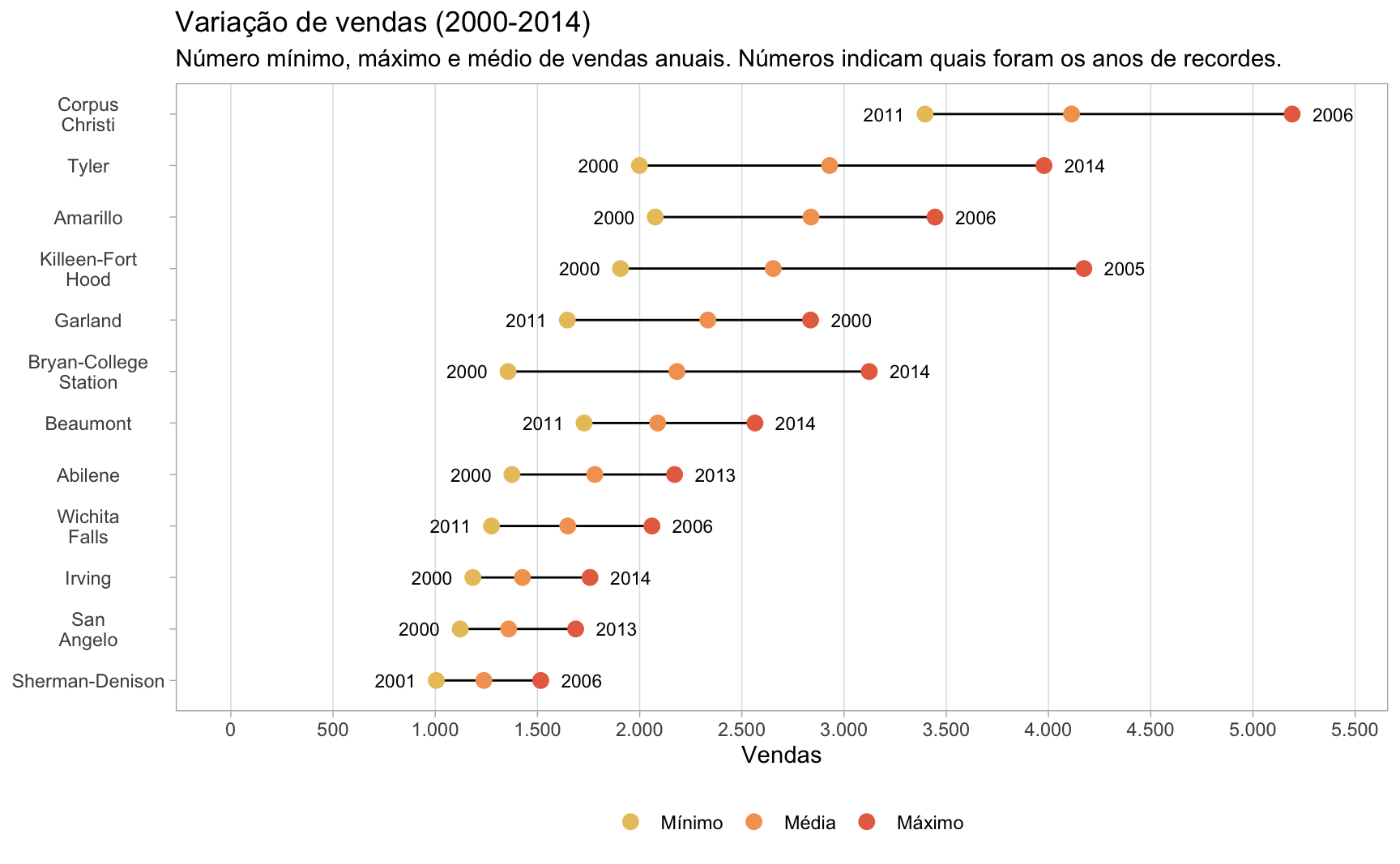 Gráficos de lollipop também podem ser utilizados para mostrar a variância num conjunto de dados entre diferentes grupos. Podemos, por exemplo, mostrar o número mínimo, máximo e médio de vendas nas cidades ao longo do período da amostra (2000 a 2015).