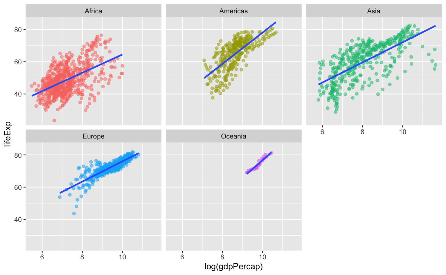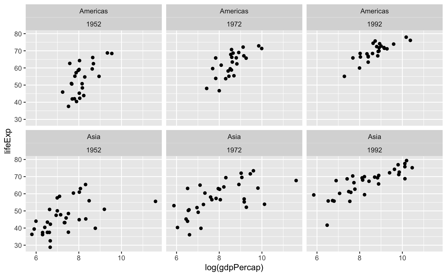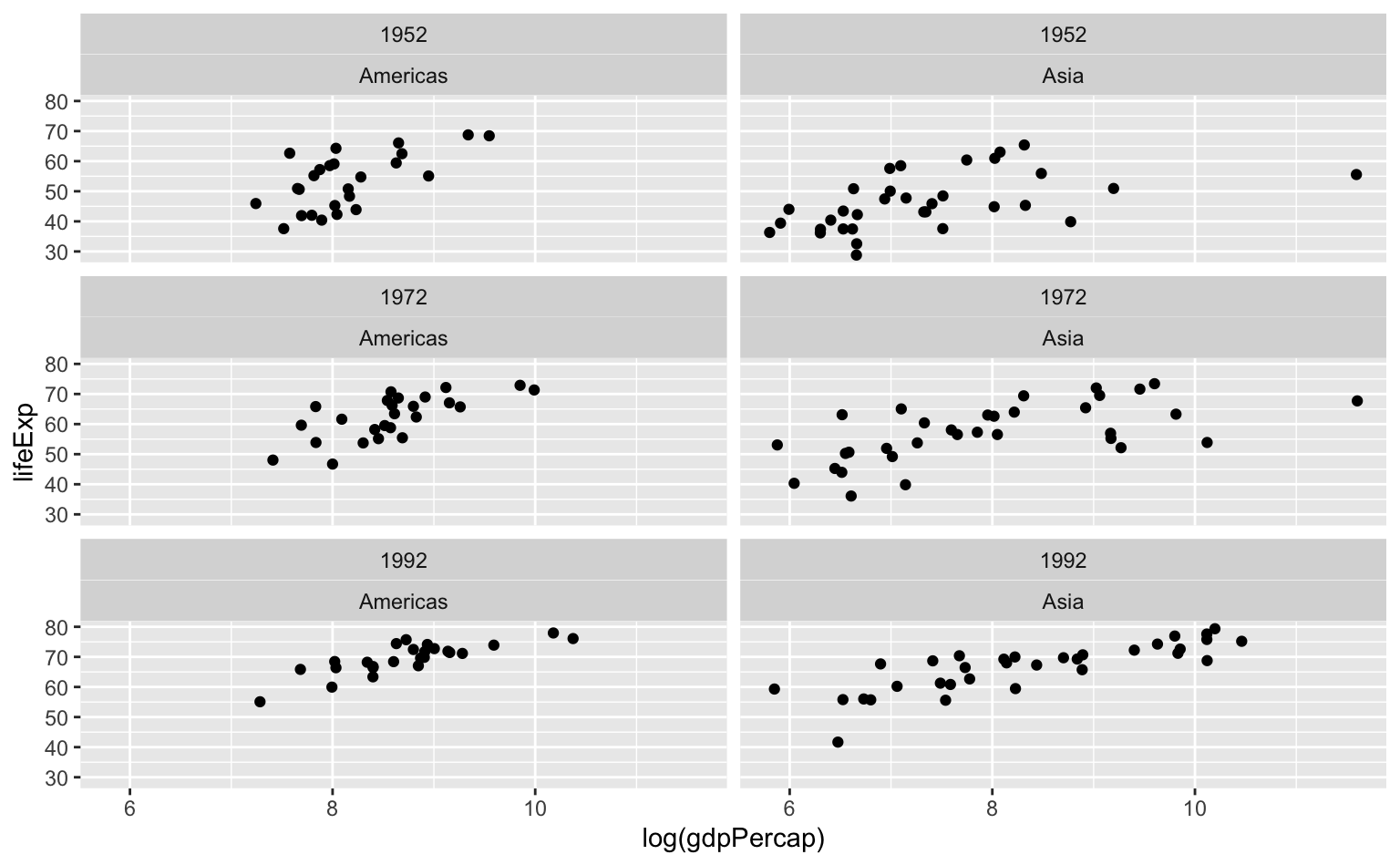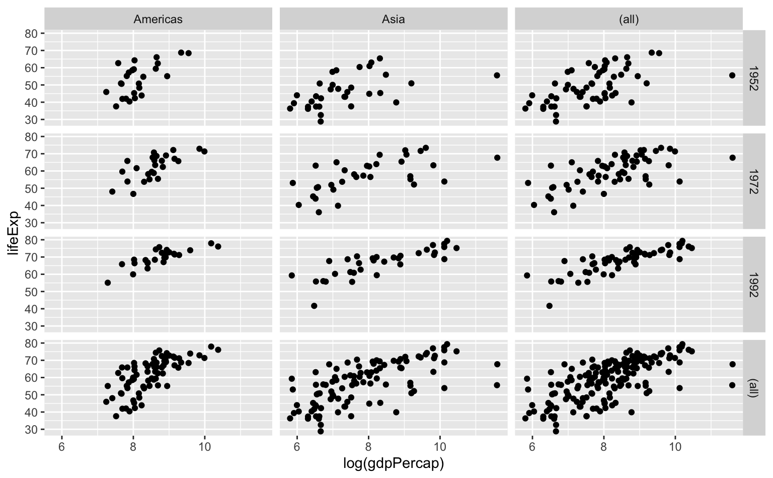facet_grid(rows = vars(year), cols = vars(continent), margins = TRUE)