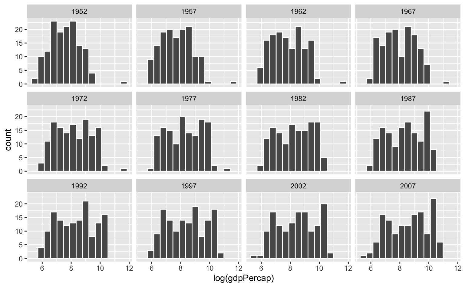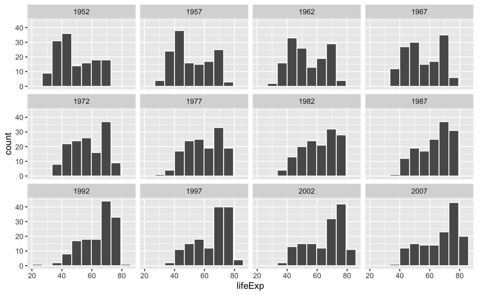 é a mais indicada quando temos uma única variável categórica e queremos visualizar a mesma informação em cada um dos níveis. Quando temos duas variáveis categóricas, vale a pena experimentar a função facet_grid()