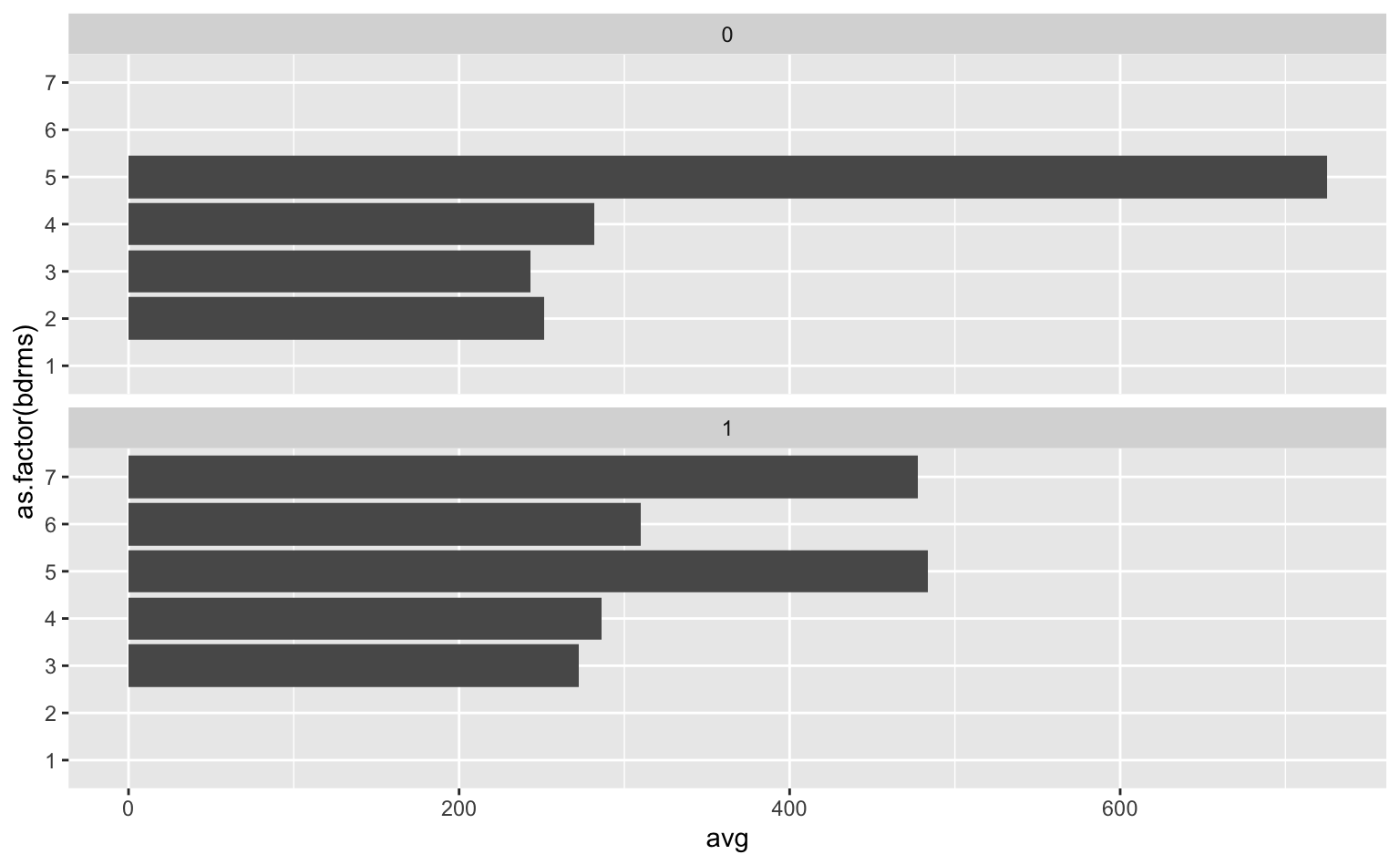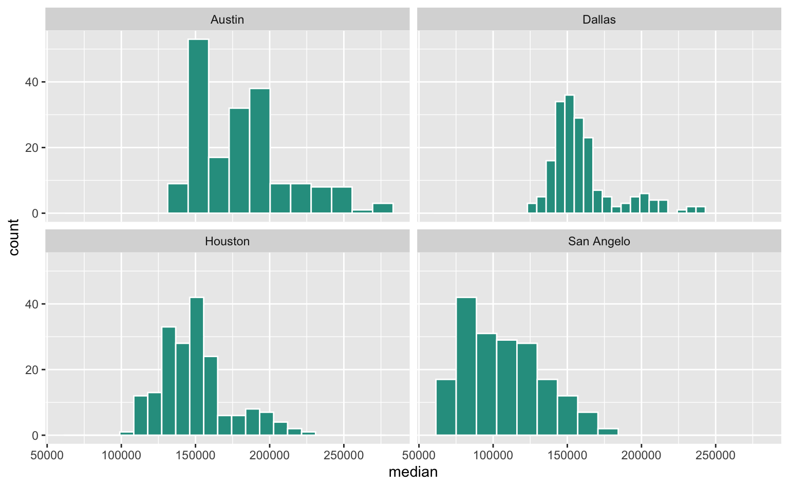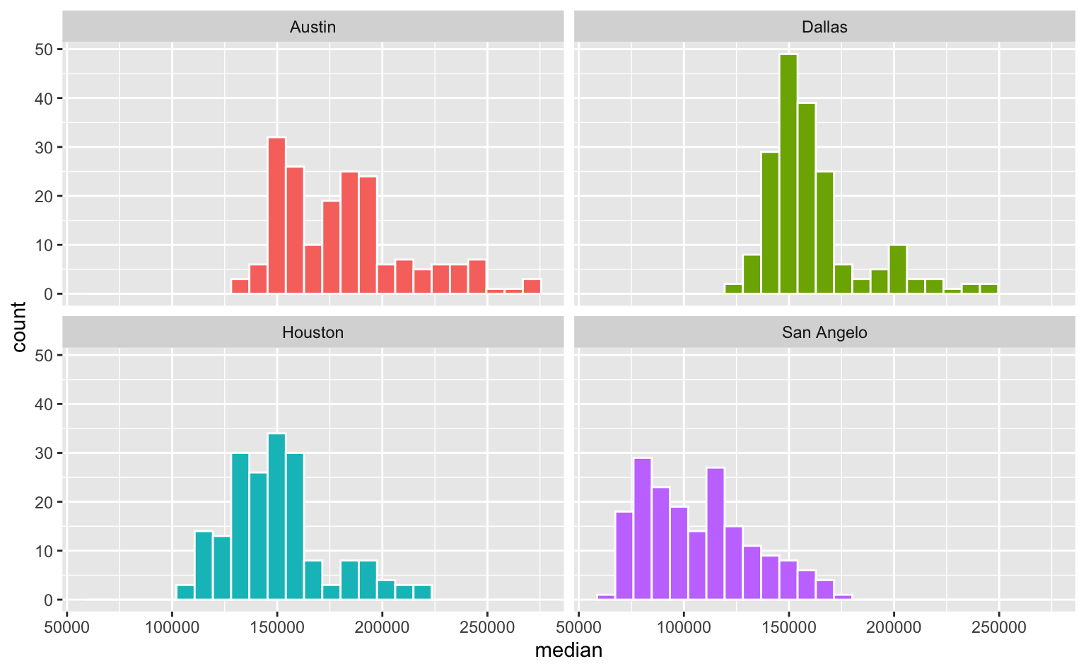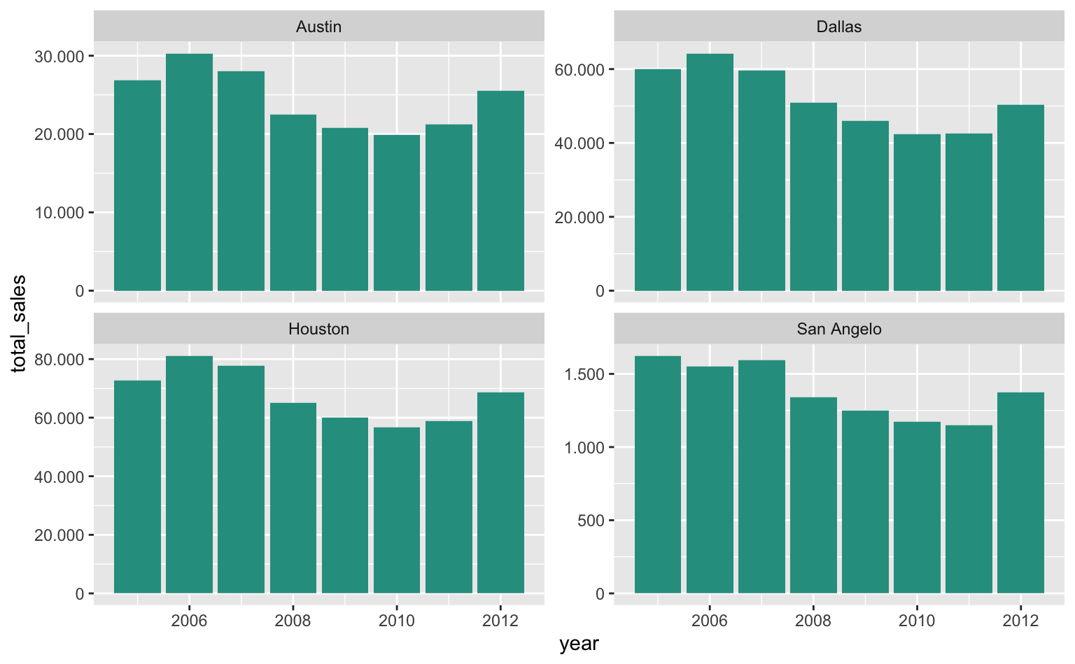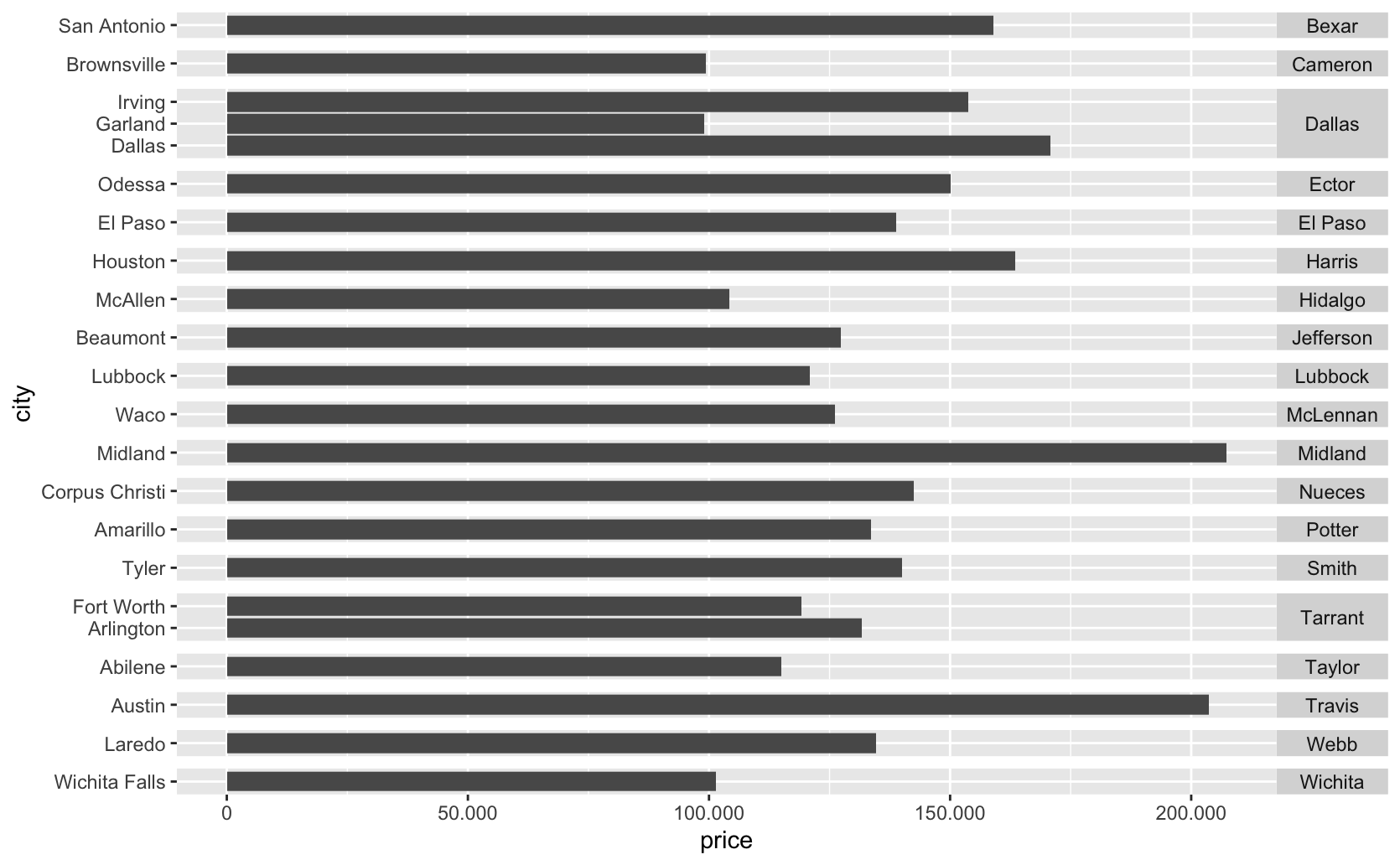 Vamos montar um gráfico que mostra o preço médio de venda em 2012 nas principais cidades do Texas (apenas cidades com mais de 100 mil habitantes), agrupando as cidades pelo condado principal as quais elas pertencem. Assim, temos uma variável categórica no eixo-x e uma variável categórica no “facet”.